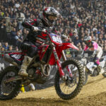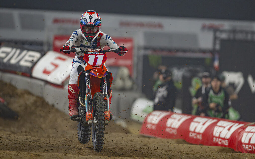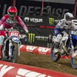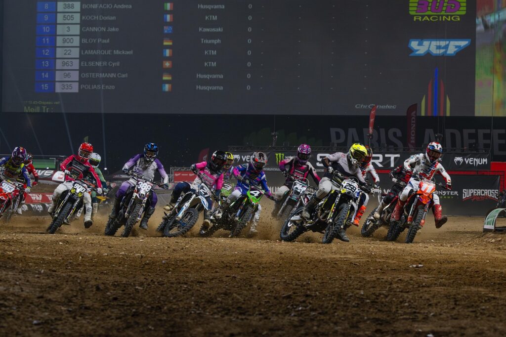 Course dans la course, chez les SX2 du championnat SX Tour qui accueillait quelques wild card dont deux d’entre elles ont pris l’ascendant, Anthony Bourdon #945 et Luke Clout. Six courses à disputer entre les deux soirées au fil desquelles Calvin Fonvieille a pu progressivement accrocher le rythme du duo de tête tout en étant challengé par ses rivaux au classement, Jules Piètre – Yamaha TMX et Saad Soulimani – TM. Incontestables meneurs et représentants du championnat SX Tour, les trois hommes ont livré de superbes chassé-croisés dans l’arène parisienne.